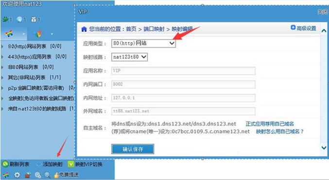2,添加使用80映射。如只是测试调试可以直接使用免费二级域名。如是正式应用也可以使用自己的域名。如本地web应用内网地址是192.168.1.22:8002,外网域名为test88.nat123.net。如有疑问的,可以直接将鼠标移动放在输入框,会有提示向导。