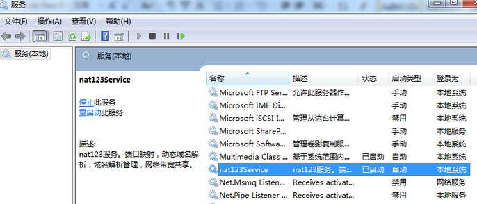 登录客户端后,会自动生成一个系统后台服务。后台服务名称nat123service,状态是已启动,启动类型是自动。