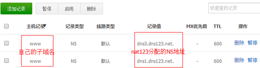 3.在解析中,记录类型选择【NS】>>主机记录填写子域名名称>>记录值填写nat123分配NS地址。如Nat123分配的NS地址有二个,同一子域名添加二个不同NS目标地址的解析。