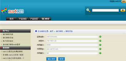 用户中心/端口映射添加,内网IP:(192.168.1.20),内网端口(8089),外网网址(abc.nat123.com),外网端口80。