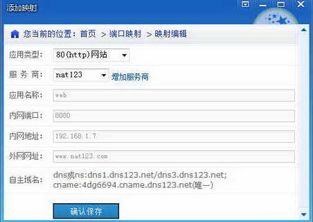 1.在内网安装并启用nat123软件。添加映射,选择80端口映射。内网地址端口是网站应用内网部署访问地址端口。外网地址可以是自己的域名,或提示免费域名。如果使用自己的域名,需要在自己的域名注册管理解析系统中,设置域名指向提示目标解析。