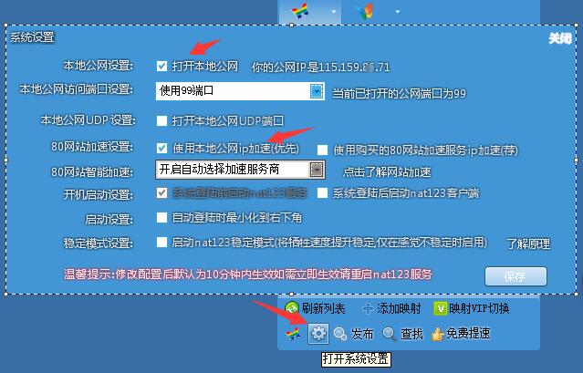 4,开启nat123的本地公网IP加速功能,位置为,客户端左下方/系统设置,勾选打开本地公网且勾选使用本地公网IP加速。本地公网端口可以根据自己本地环境选择使用80、443、99任意其中端口号,同时需要确保相关防火墙入站规则有允许使用的端口号。