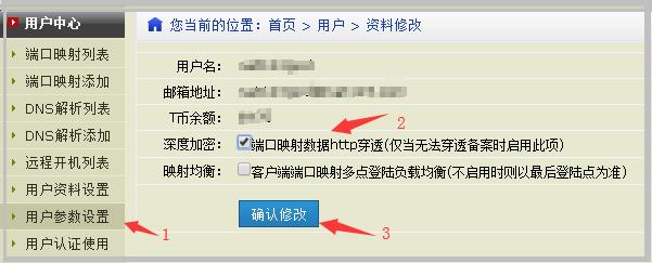 1,使用nat123穿透开启数据加密http穿透备案环境。注册并登录nat123官网左侧/用户中心/用户参数设置/勾选数据加密http穿透备案并确认修改。
