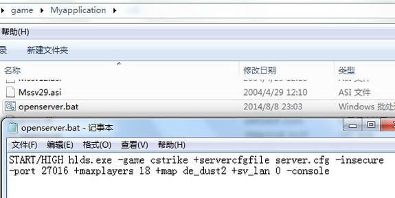 参数说明:调用联机服务hlds.exe和服务配置server.cfg,自定义服务端口27016,定义最大人数18。