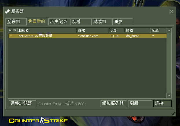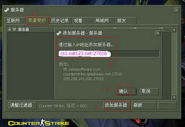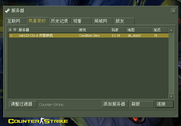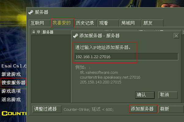 可在本机或内网其他机子测试。运行CS游戏/搜索服务器/我喜爱的/添加服务器,输入内网开服主机IP和开服端口(192.168.1.22:27016)。