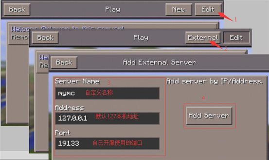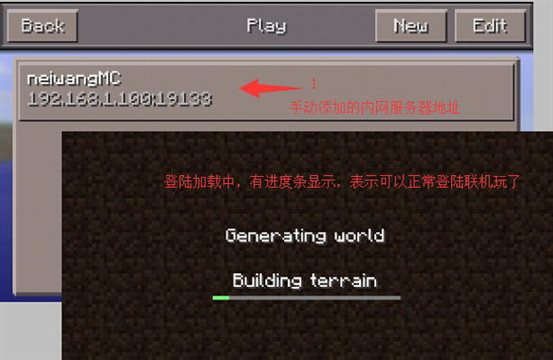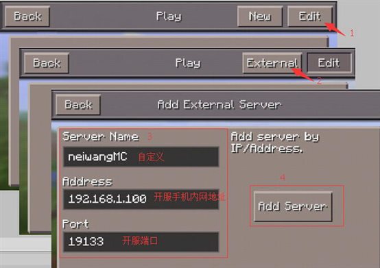 当自动发现的服务进不了后,需要手动添加具体的服务地址登陆。编辑/其他网络/输入自己本手机开服地址和开服使用的端口号,添加保存。