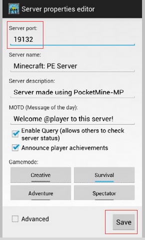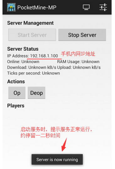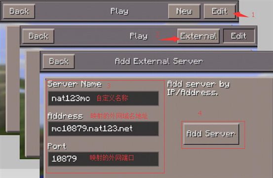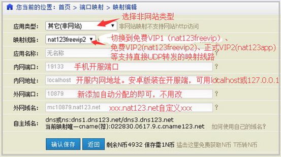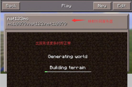 到此,只要你的手机同时运行开服器和nat123,即可提供全世界的所有基友一起联机来玩。告诉你的基友,你的映射后的外网地址域名和外网端口,让他们联机接入即可。自己及所在局域网内的机友可以使用内网IP2地址来联机,不要白白浪费占用网络流出流量。