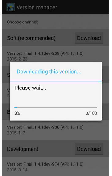 出现下载中,有个下载进度提示,等待下载完成。等待时间看你wifi速度了,网速好的一般要不了几分钟,网速不好时需要多点时间,如网速不给力有可能会一直卡在下载中。如网络不稳定导致提示下载失败,可多次尝试或下载其他版本尝试,或避开上网高峰时。建议在网络较好环境及少人上网时段执行此操作。(我家的聚友E家白天少人用时很快,晚上多人用时这步就卡住了下载中进度几乎没有)