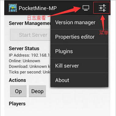 可以查看集训到右上角有个菜单,点击出现相关子菜单。Version manager版本管理可重新选择下载使用各个版本。properties editor项目编辑(开服参数配置);kill server可以结束服务,当stop server无法结束服务时可以使用它。