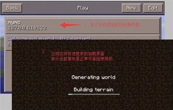 在服务列表出现自己添加的目标服务器,登陆它。有进度条出现表示可以正常联机的。