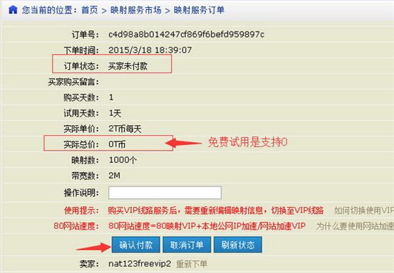 如是免费试用的,则支付0。状态为未付款时,确认付款即可。