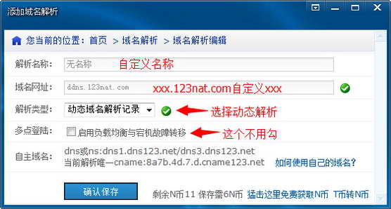 选择动态域名解析记录,使用免费二级域名,或自己的域名。鼠标放在输入框有向导提示。
