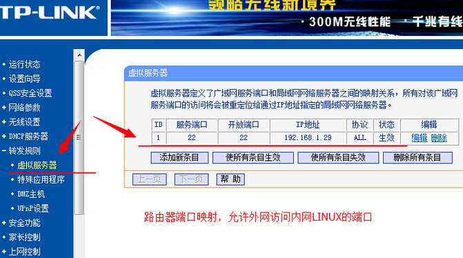 因为公网IP是在路由器上的,外网访问时,需要经过路由,需要在路由器上做端口映射,将内网LINUX服务器访问22端口打通。路由器端口映射位置:转发规则/虚拟服务器/添加允许外网访问端口和协议。我的LINUX服务器SSH服务端口是默认的22,我内网对应LINUX服务器主机的内网IP地址是192.168.1.29。