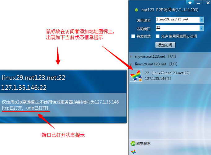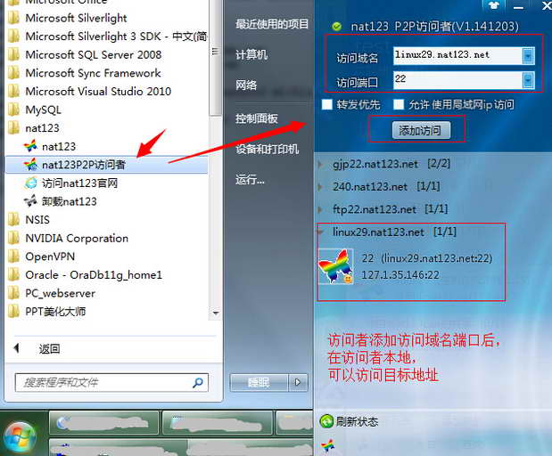 3,外网访问端安装nat123客户端并使用访问者。