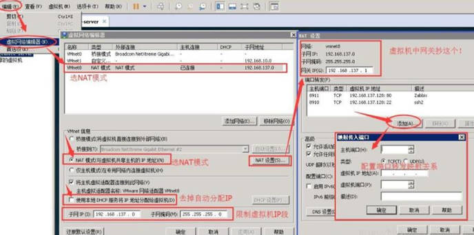 打开“虚拟网络编辑器”,选择NAT设置,添加端口映射规则(如主机端口8000映射到虚拟机端口8000)。