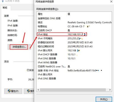 4、点击“详细信息”按钮即可查看IP地址等详细信息;在弹出的窗口中可以看到IPv4 地址、子网掩码、默认网关、DHCP服务器等;