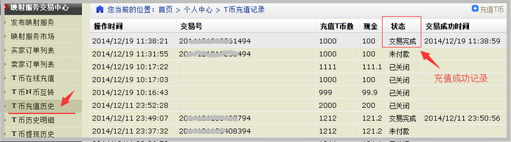 如T币充值历史查看记录。交易成功记录即是充值成功记录。