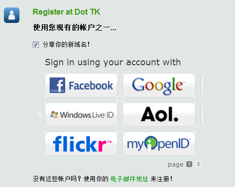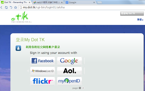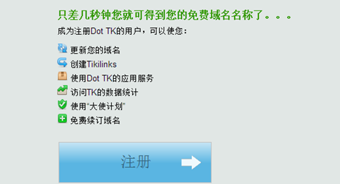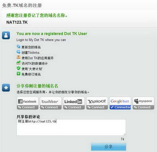 点击“Sign In”用当前google帐号进入进行注册。马上就提示注册免费的tk顶级域名成功。