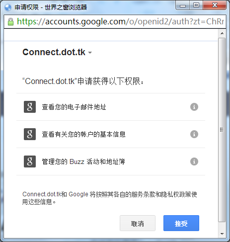 选择google帐号登录时,提示你“接受”。接受后自动转跳到my.tk