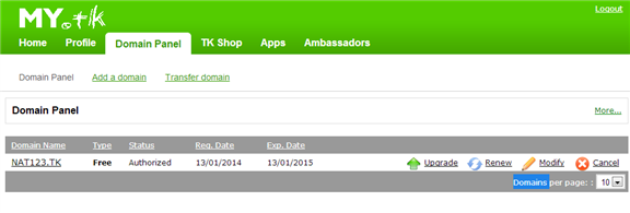 直接点击自己的域名(nat123.tk)或Modify(修改)进行域名的url/IP指向/cname指向/mx记录/dns设置等配置。