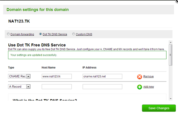 nat123使用自主tk域名时,需要在自己的tk域名管理系统中,将域名cname/NS/DNS其中一种设置由nat123解析。