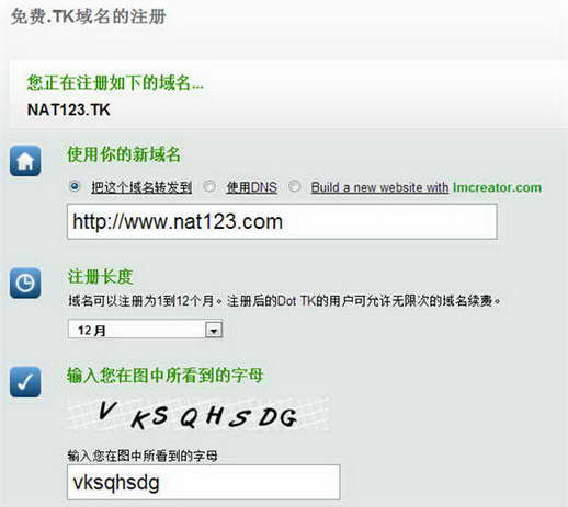 免费的tk域名长度不可以少于4个字符,转到正在注册域名页面后,随便填写个URL、注册时间长度当然选最长的12月、及验证码字母。