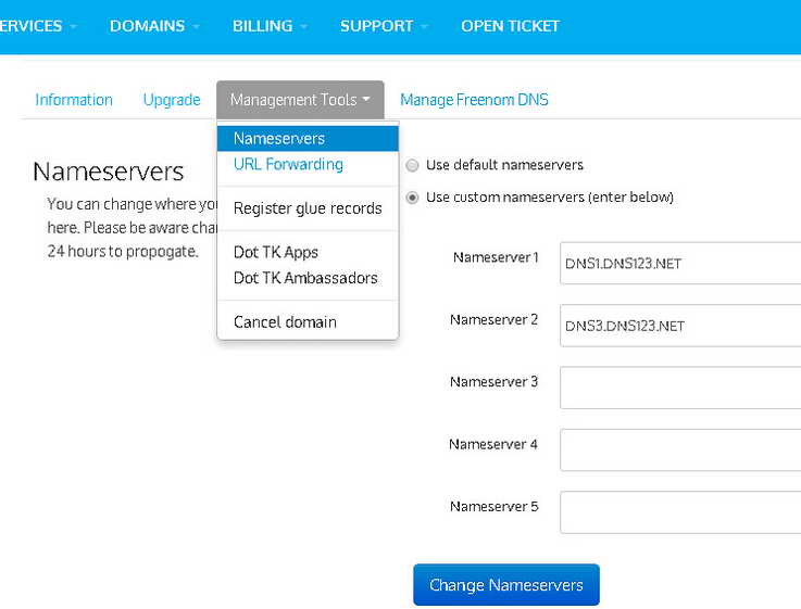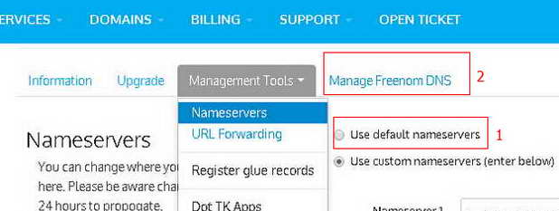 management tools/nameservers/Use default nameservers先设置域名由TK本身DNS解析,然后即可在Manage Freenom DNS设置cname/ip等解析记录。步骤参考下图二步。