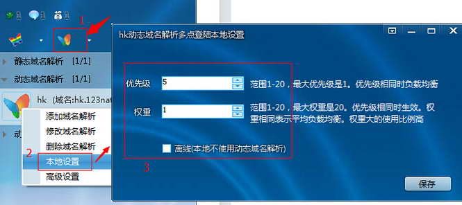 2.保存动态域名解析记录后,可在多机登录/动态解析图标右键/本地设置。可设置是否离线(本地是否解析),及解析的优先级和解析权重。
