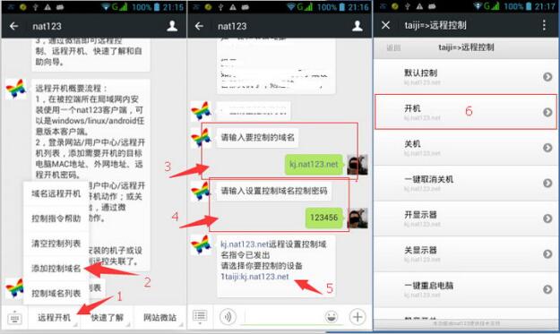 微信管理中,远程开机步骤:远程开机菜单/添加控制域名/输入开机外网地址/输入开机密码/触点开机地址,自动打开开机功能列表,触点“开机”。