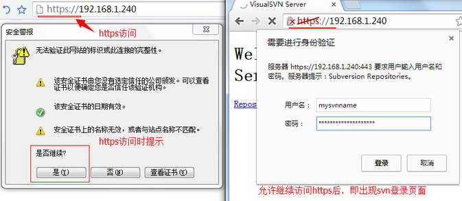 如我内网svn办公应用访问地址是https://192.168.1.240:443,在内网是可以直接访问的,浏览器访问https时可能会有证书提示,允许继续“是”访问即可进入svn登录页面。