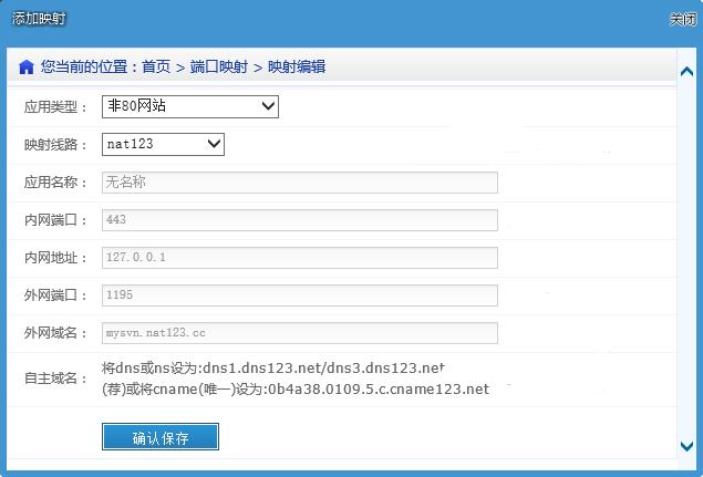 在svn办公应用服务器局域网内安装nat123客户端,并注册登录使用它。客户端主面板/端口映射列表/添加映射。设置映射信息(鼠标停留选择输入框可参考提示选择填写)。