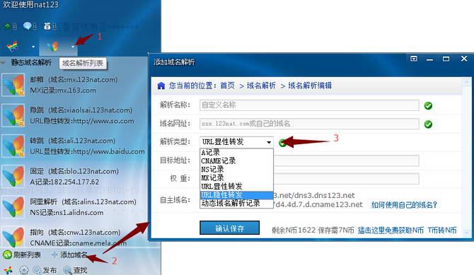 2. 域名解析功能:A记录/CNAME记录/NS记录/MX记录/URL显性转发/URL隐性转发。