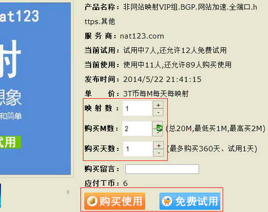 产品详情页面自定义映射数、购买M数、购买天数等配置,然后点击“购买使用”。