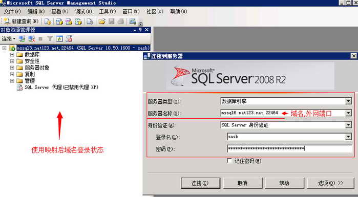 注意MSSQL客户端连接时使用“域名+英文逗号+端口”方式。