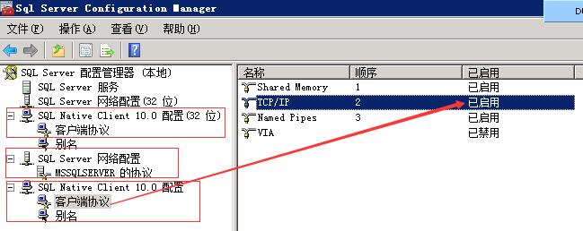 打开数据库的配置管理工具,配置相关的客户端协议,开启TCP/IP,
