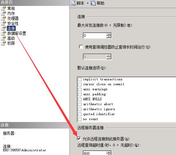数据库【链接】,勾选允许远程连接到此服务器,