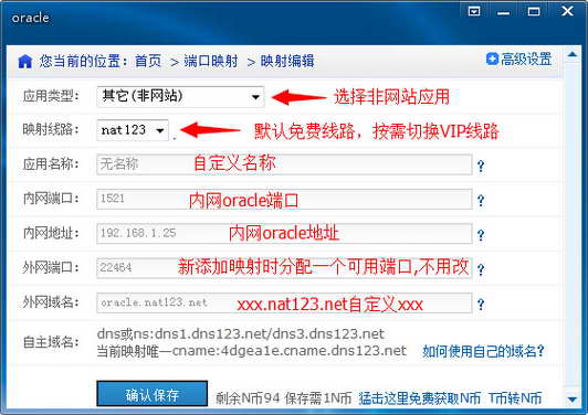 内网使用nat123端口映射之非网站应用映射,将内网oracle数据库访问地址,映射到外网,实现外网的访问。