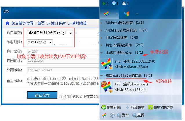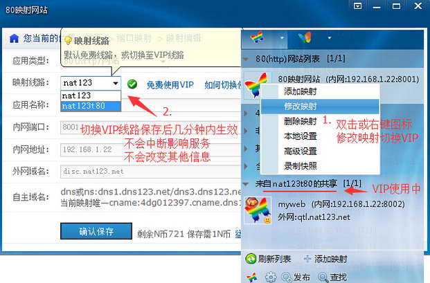 双击客户端映射图标或右键图标修改映射,重新编辑映射信息,将默认的免费nat123映射服务切换为自己购买的VIP线路,保存后几分钟内生效。如80映射VIP组nat123a80、nat123t80、nat123can等不同的VIP线路。