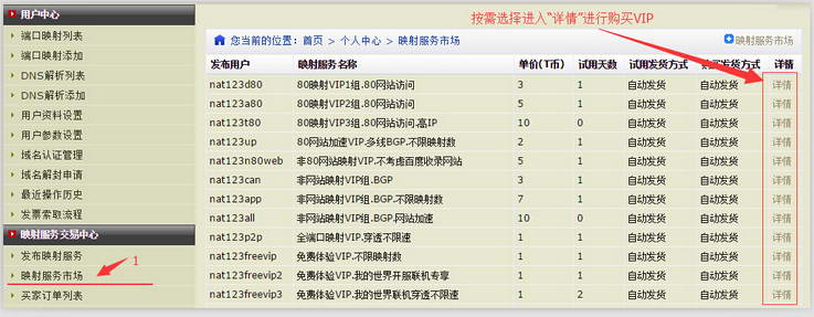 不同的VIP线路组,支持不同的映射应用类型。如nat123a80映射VIP支持80映射网站,nat123can映射VIP支持访问内网应用。