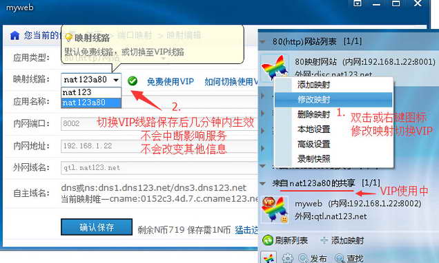 购买VIP后,重新编辑映射,将默认免费线路切换到已购买的VIP服务。不切换的话,VIP不生效!